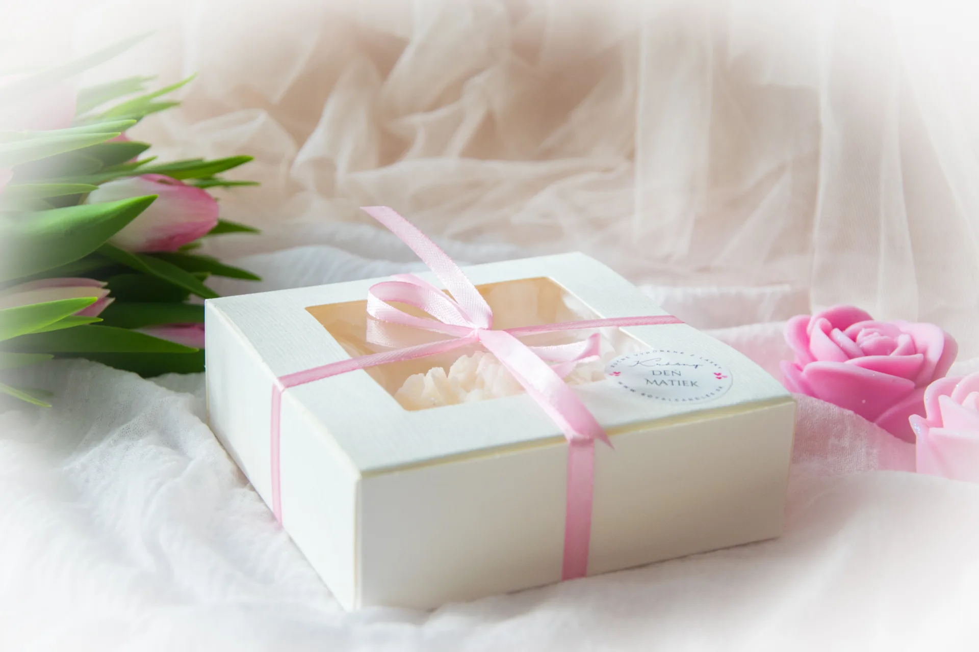 elegantnej darčekovej krabičke s jemnou ružovou stuhou je navrhnutá