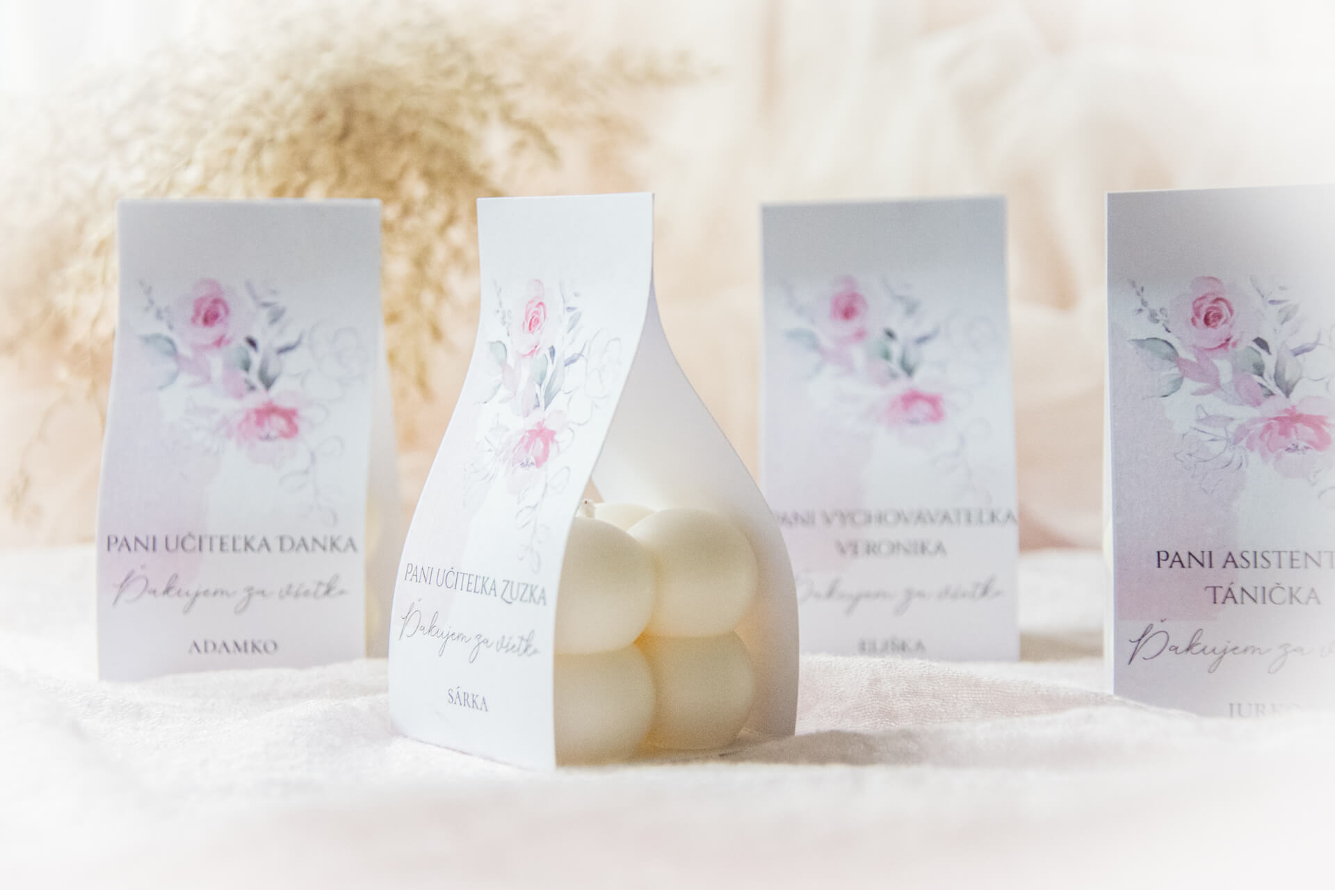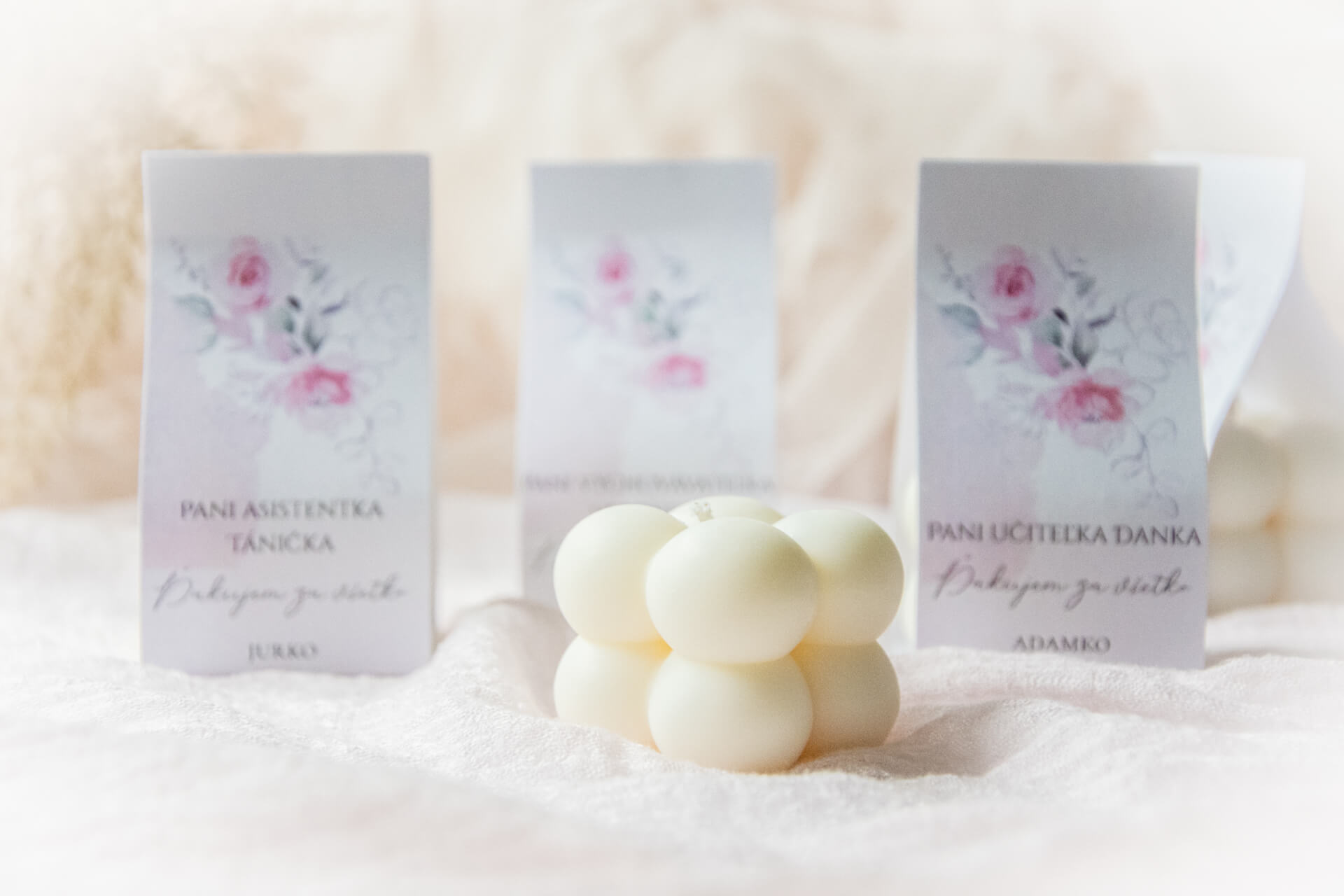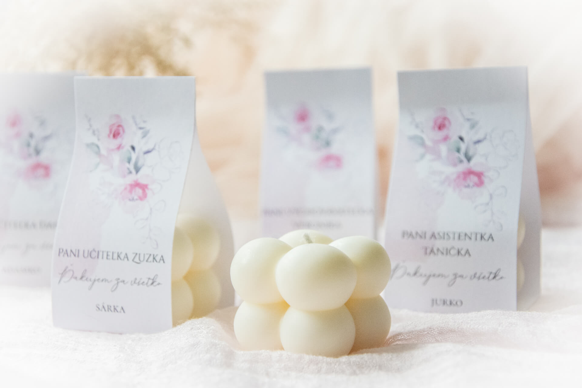 Ak hľadáte malý milý darček pre Vašu pani učiteľku alebo vychovávateľku, táto minisviečka v tvare bubliniek je tou správnou voľbou. Navyše na darčekové balenie je možné dať osobné venovanie a prejaviť tak vďaku Vášho školáka či školáčky. Pretože nie je podstatné, aký veľký je darček, ale či je darovaný z lásky...a tento darček určite zahraje pri srdci...Darček, v podobe tejto sviečky, je vhodný ako poďakovanie pre pani učiteľku, vychovávateľku, osobnú asistentku, pani riaditeľku, či kohokoľvek, komu sa chcete poďakovať, či ho potešiť. Sviečka je darčekovo zabalená v craftovom papieri s kvetinovým motívom a milým ďakovným textom, ktorý je možné doplniť o osobné oslovenie a venovanie. Stačí nám ich napísať do textových polí nižšie a my Vám vyrobíme darček na mieru. Toto je jednoducho malý dokonalý darček pre veľkú radosť. Sviečka je ručne odlievaná zo 100%-ného prírodného sójového vosku V jej srdci sa nachádza bavlnený knôt, vďaka ktorému sviečka horí jasným a čistým plameňom. Sviečka je jedinečná svojím tvarom a vyrábaná s láskou a trpezlivosťou. Vytvorenie takejto sviečky trvá niekoľko hodín. Môže mať malé nedokonalosti, ktoré však z každej sviečky robia unikátny kúsok. Naše odporúčania: Odporúčame Vám použiť tieto sviečky predovšetkým ako dekoráciu. Ak si ju chcete zapáliť, radíme vám umiestniť pod ňu tanierik, ktorý by zachytil zvyšky stekajúceho vosku. Pred každým zapálením nezabudnite skrátiť knôt na cca 0,5 cm. Horiace sviečky nikdy nenechávajte bez dozoru. Rozmery sviečky:- hmotnosť vosku - cca 40g- šírka - cca 4 cm- výška - cca 3,5 cm.