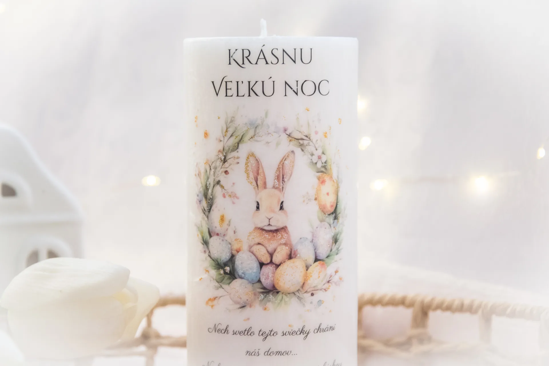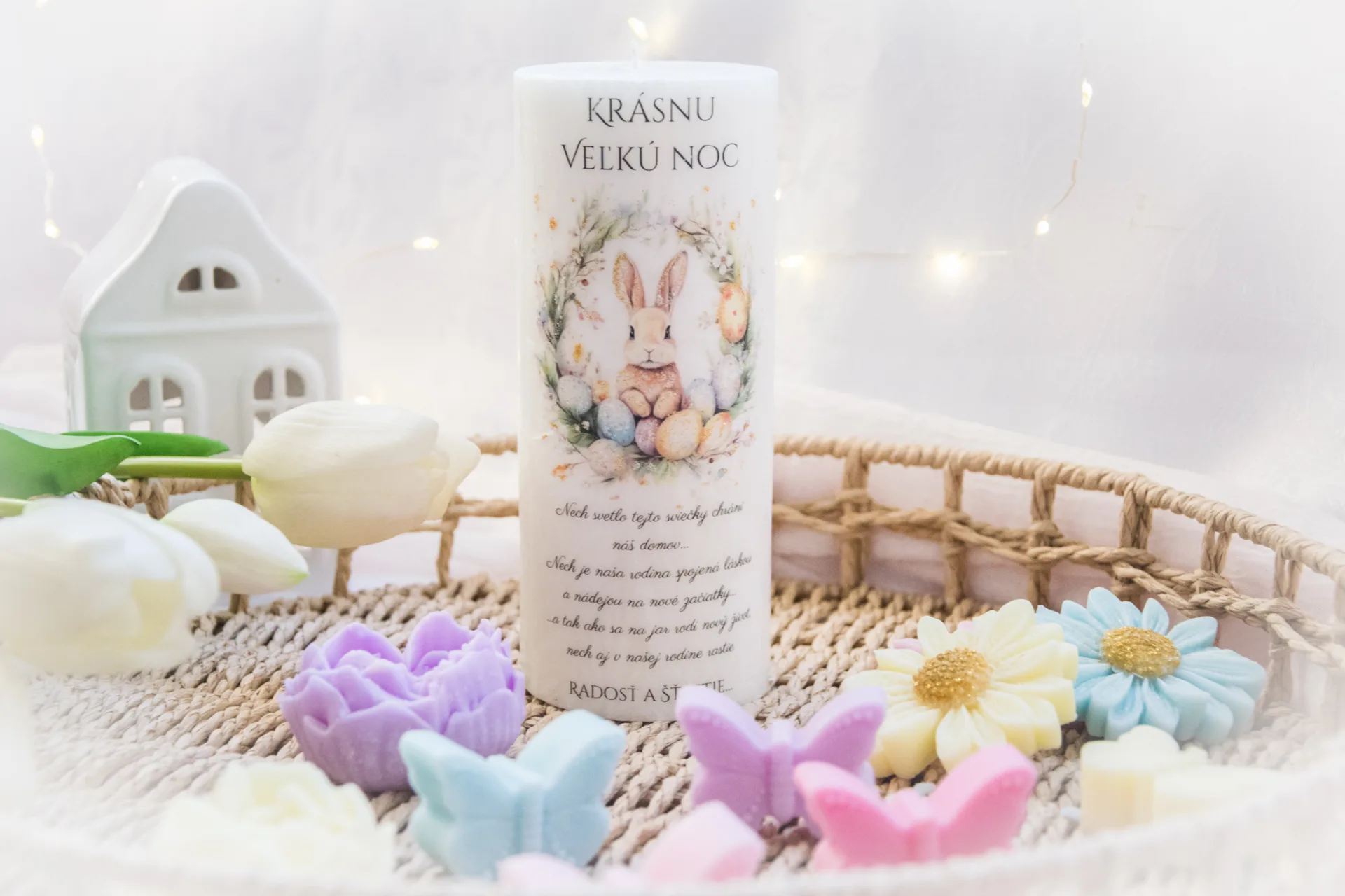 Táto sviečka prináša do vášho domova teplo, svetlo a veľkonočnú pohodu. Je zdobená veselým motívom zajačika a farebných veľkonočných vajíčok, ktoré symbolizujú radostné prebúdzanie jari a nového života.