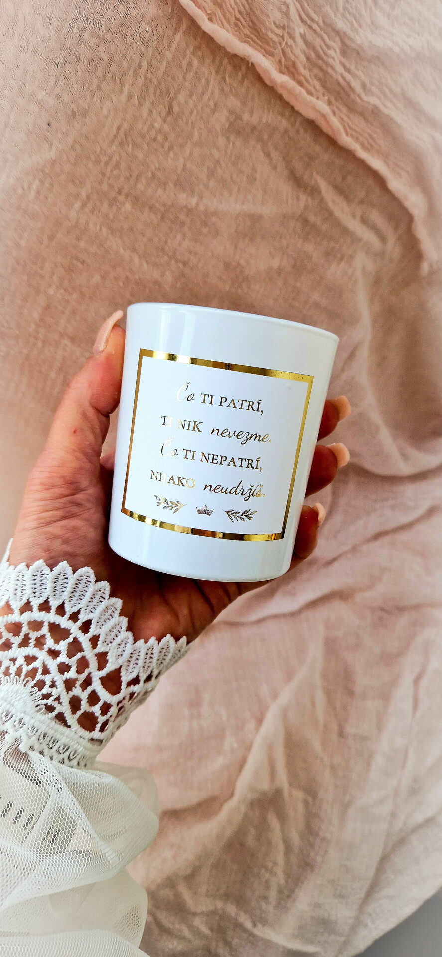 ...objímam Ťa, žena...aby si sa cítila v bezpečí...a aby si vedela, že......čo Ti patrí, Ti nik nevezme......čo Ti nepatrí, nijako neudržíš...S radosťou vám predstavujeme túto jedinečnú sviečku, ktorá je s láskou ručne vyrobená z toho najkvalitnejšieho 100% prírodného vosku, ktorý sa na povrchu trbliece ako čerstvo napadaný sneh. Je odlievaná s unikátnym dreveným knôtom, ktorý počas horenia jemne praská ako drevo v krbe a je zdobená prekrásnou etiketou v elegantnom zlatom dizajne so silným odkazom. Text na sviečke: Čo ti patrí, ti nik nevezme, čo ti nepatrí, nijako neudržíš. Sviečku Vám môžeme vložiť aj do hnedej darčekovej krabičky ozdobenej saténovou stuhou. Jej jemná vôňa vanilky vás objíme vždy, keď to budete potrebovať. Rozmery sviečky:- pohár z bieleho skla - 8,5cm * 7cm- hmotnosť vosku - 170g- doba horenia - cca 50 hodín.Pri jej pálení nezabudnite dodržiavať bezpečnostné upozornenia a pred každým zapálením skráťte knôt na cca 5 mm.