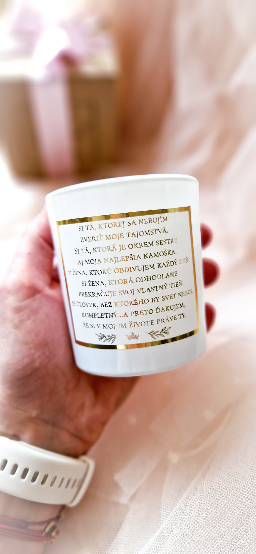 Táto sviečka nie je pre každú sestru, ale pre tú, ktorá je Tvojou spriaznenou dušou...ktorú nadovšetko obdivuješ a vážiš si ju. Je pre sestru, na ktorú sa vždy môžeš spoľahnúť. A platí to vzájomne. Áno, táto sviečka je pre výnimočnú ženu v tvojom živote a ty chceš, aby o tom vedela... Text na sviečke: Si tá, ktorej sa nebojím zveriť moje tajomstvá. Si tá, ktorá je okrem sestry aj moja najlepšia kamoška. Si žena, ktorú obdivujem každý deň. Si žena, ktorá odhodlane prekračuje svoj vlastný tieň. Si človek, bez ktorého by svet nebol kompletný... ...a preto ďakujem, že si v mojom živote práve ty. Ak máš aj Ty tak výnimočnú sestru, ktorá potrebuje čítať presne tieto slová, možno je táto sviečka práve pre ňu.Sviečka je s láskou ručne vyrobená z toho najkvalitnejšieho 100% prírodného vosku, ktorý sa na povrchu trbliece ako čerstvo napadaný sneh. Je odlievaná s unikátnym dreveným knôtom, ktorý počas horenia jemne praská ako drevo v krbe a zdobená prekrásnou etiketou v elegantnom zlatom dizajne so silným odkazom.Sviečku môžeme vložiť aj do hnedej darčekovej krabičky ozdobenej saténovou stuhou.Rozmery sviečky:- pohár z bieleho skla - 8,5cm * 7cm- hmotnosť vosku - 170g- doba horenia - cca 40 hodín.Pri jej pálení nezabudnite dodržiavať bezpečnostné upozornenia a pred každým zapálením skráťte knôt na cca 5 mm.