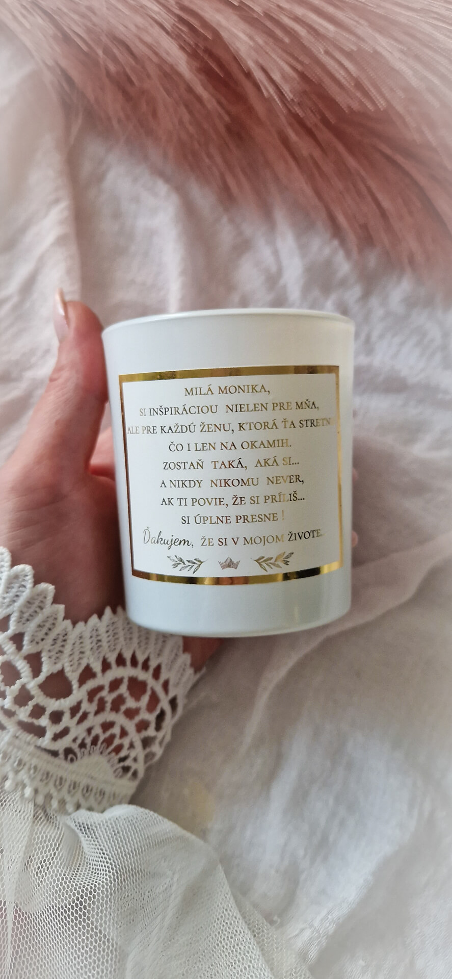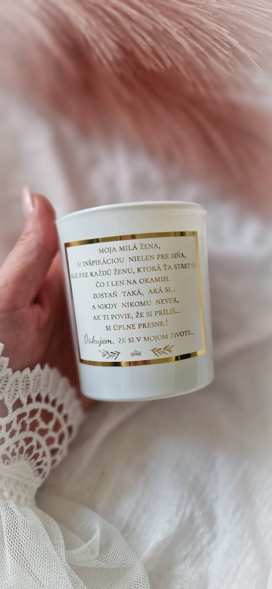 Táto sviečka je pre ženu, ktorú obdivuješ a vážiš si ju. Je pre ženu, ktorá tej druhej vždy s láskou napraví korunu, keď vidí, že ju má nakrivo. Pre ženu, ktorá ostatným dopraje, pretože sama vie, akú má hodnotu, a preto nemá potrebu s ostatnými súťažiť a porovnávať sa. Pre ženu, ktorá vie, že si nie sme konkurenciou a že keď sa spojíme, dokážeme viac. Táto sviečka je pre výnimočnú ženu v tvojom živote a ty chceš, aby o tom vedela... Text na sviečke: Moja milá žena,si inšpiráciou nielen pre mňa, ale pre každú jednu, ktorá Ťa stretne čo i len na okamih. Zostaň prosím taká aká si...a nikdy nikomu never, ak Ti povie, že si príliš...si úplne presne! Ďakujem, že si v mojom živote... Ak máš aj Ty vo svojom okolí takúto výnimočnú ženu, ktorá potrebuje čítať presne tieto slová, možno je práve táto sviečka presne pre ňu. Sviečka je s láskou ručne vyrobená z toho najkvalitnejšieho 100% prírodného vosku, ktorý sa na povrchu trbliece ako čerstvo napadaný sneh. Je odlievaná s unikátnym dreveným knôtom, ktorý počas horenia jemne praská ako drevo v krbe a zdobená prekrásnou etiketou v elegantnom zlatom dizajne so silným odkazom.Sviečku môžeme vložiť aj do hnedej darčekovej krabičky ozdobenej saténovou stuhou.Rozmery sviečky:- pohár z bieleho skla - 8,5cm * 7cm- hmotnosť vosku - 170g- doba horenia - cca 40 hodín.Pri jej pálení nezabudnite dodržiavať bezpečnostné upozornenia a pred každým zapálením skráťte knôt na cca 5 mm.