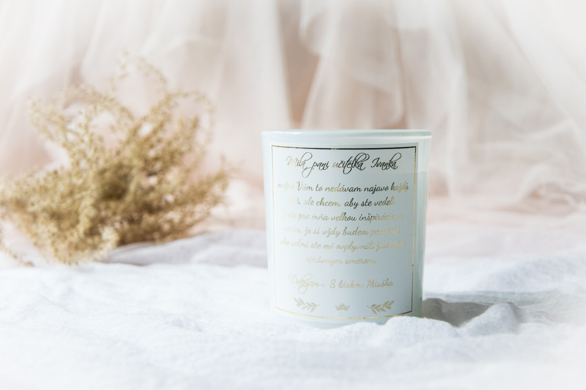 Tieto sviečky sme s Miuškou vytvorili pre všetky úžasné pani učiteľky ako poďakovanie za ich celoročnú prácu. Vieme, že práca pedagóga je jedna z najťažších a najdôležitejších, preto chceme aj takto poďakovať každej jednej úžasnej osôbke, ktorá svoju prácu berie ako poslanie. Ďakujeme vám za to...Text na sviečke:Milá pani učiteľka, možno Vám to nedávam najavo každý deň, ale chcem, aby ste vedeli, že ste pre mňa veľkou inšpiráciou a verím, že si vždy budem pamätať, ako veľmi ste mi ovplyvnili život tým správnym smerom. Ďakujem. S láskou...(vaše osobné venovanie)Sviečku je možné personalizovať, stačí ak vyplníte textové polia nižšie a my Vám vyrobíme sviečku na mieru. Každá naša sviečka je s láskou ručne vyrobená z toho najkvalitnejšieho 100% prírodného vosku, ktorý sa na povrchu trbliece ako čerstvo napadaný sneh. Je odlievaná s unikátnym dreveným knôtom, ktorý počas horenia jemne praská ako drevo v krbe a je zdobená prekrásnou etiketou v elegantnom zlatom dizajne s ďakovným odkazom. Sviečka je zabalená v celofánovom papieri, príp. Vám ju môžeme vložiť aj do hnedej darčekovej krabičky ozdobenej saténovou stuhou. Rozmery sviečky:- pohár z bieleho skla - 8,5cm * 7cm- hmotnosť vosku - 170g- doba horenia - cca 30 hodín.Pri jej pálení nezabudnite dodržiavať bezpečnostné upozornenia a pred každým zapálením skráťte knôt na cca 5 mm.