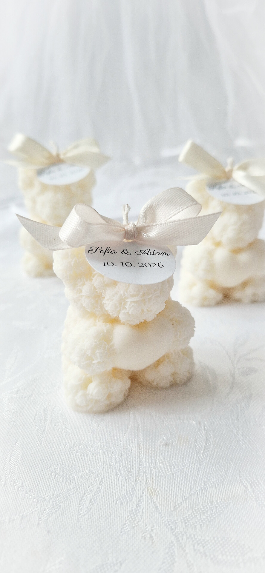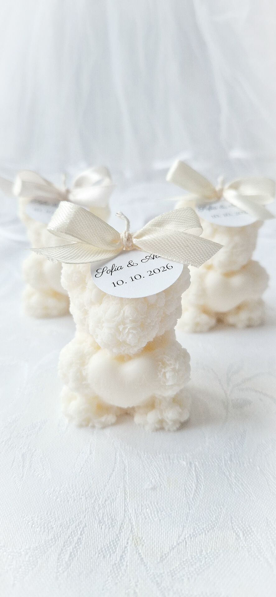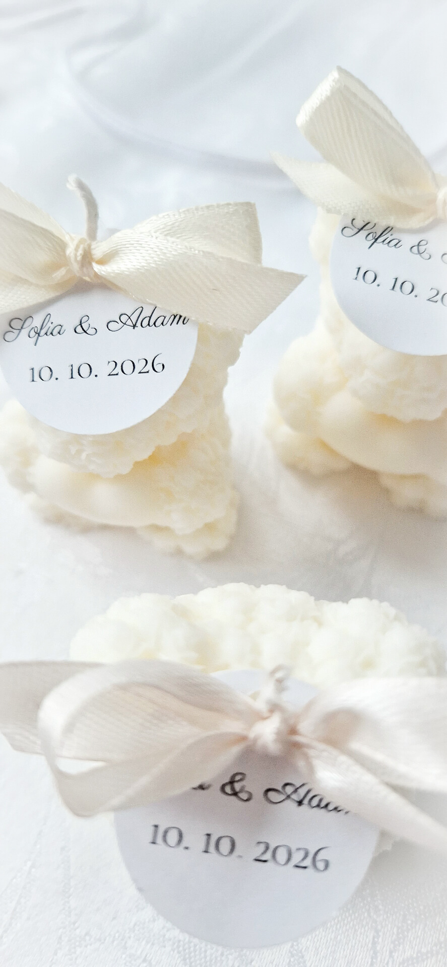 Obdarujete Vašich svadobných hostí jedinečným darčekom, ktorý im bude pripomínať Váš VEĽKÝ DEŇ. Táto prírodná sviečka je ozdobená saténovou mašličkou a medailónom s Vašimi iniciálmi. Stačí, ak nám Vaše mená a dátum svadby napíšete do polí nižšie a my pre Vás vyrobíme výnimočné a osobné darčeky na mieru. Každá sviečka z tejto kolekcie je ručne vyrobená zo 100-ného sójového vosku a v jej srdci sa nachádza bavlnený knôt, vďaka ktorému sviečka horí jemným plamienkom. Je jedinečná svojím tvarom a vyrábaná s láskou a trpezlivosťou. Vytvorenie takejto sviečky trvá niekoľko hodín. Môže mať malé nedokonalosti, ktoré však z každej sviečky robia unikátny kúsok. Sviečku je možné vložiť aj do papierového obalu alebo tylu, čo pôsobí veľmi elegantne. Na výber máte aj niekoľko vôní tej najvyššej kvality. Je to jednoducho dokonalý darček, ktorým potešíte tých, s ktorými ste sa rozhodli osláviť spečatenie Vašej lásky. Vďaka tejto sviečke si tak odnesú kúsok atmosféry z Vášho svadobného dňa so sebou... Prečo si vybrať práve naše sviečky? - sú ručne vyrobené na Slovensku v malej rodinnej dielni - vyrobené z čisto prírodných materiálov - sú vegánske a šetrné k nášmu životnému prostrediu - horia dlhšie ako bežné parafínové sviečky - sú netoxické, neobsahujú olovo ani iné škodlivé látky Sviečky sú vyrábané na objednávku, preto ich odoslanie môže trvať viac dní. Rozmery sviečky: - hmotnosť vosku - cca 50g - výška - cca 6 cm - šírka - cca 5 cm