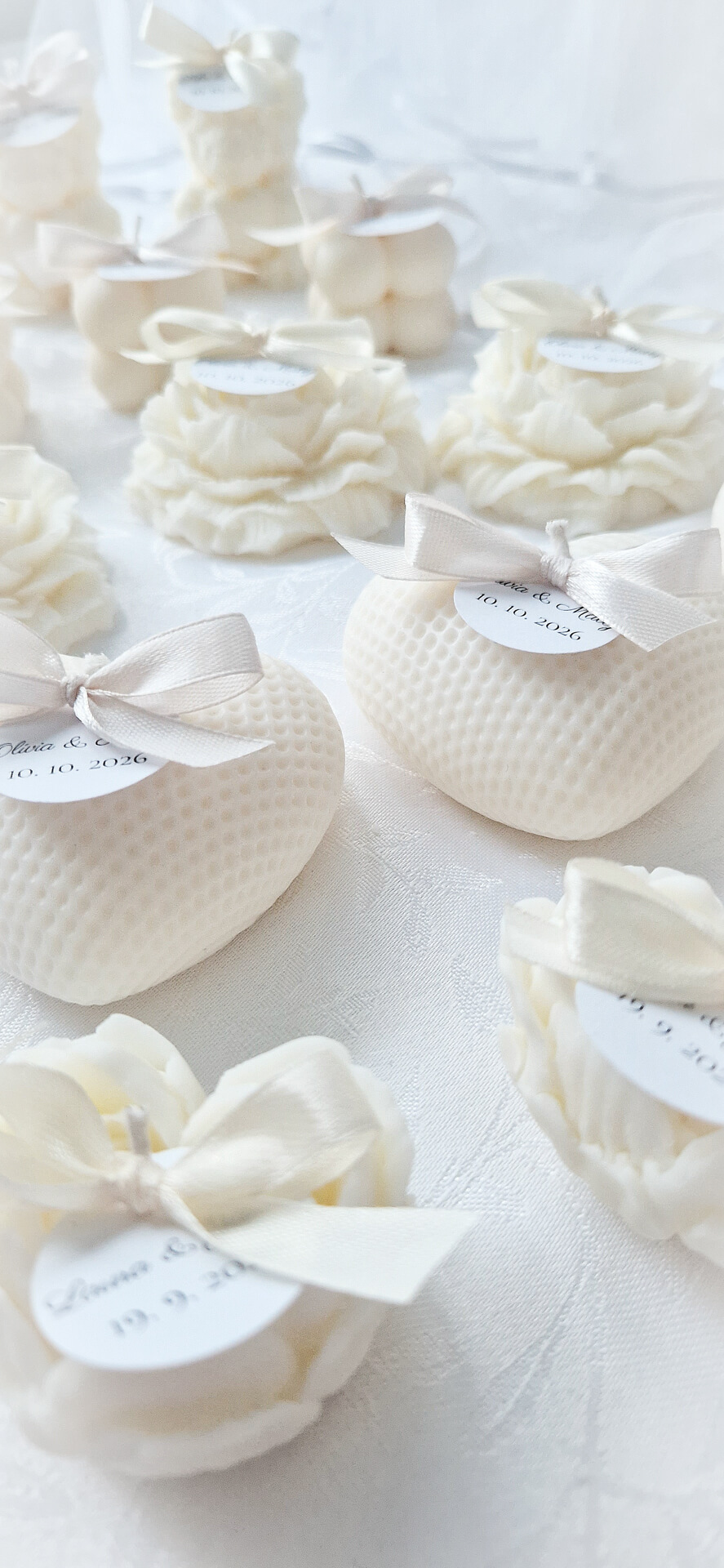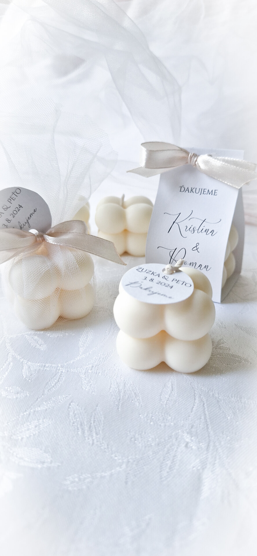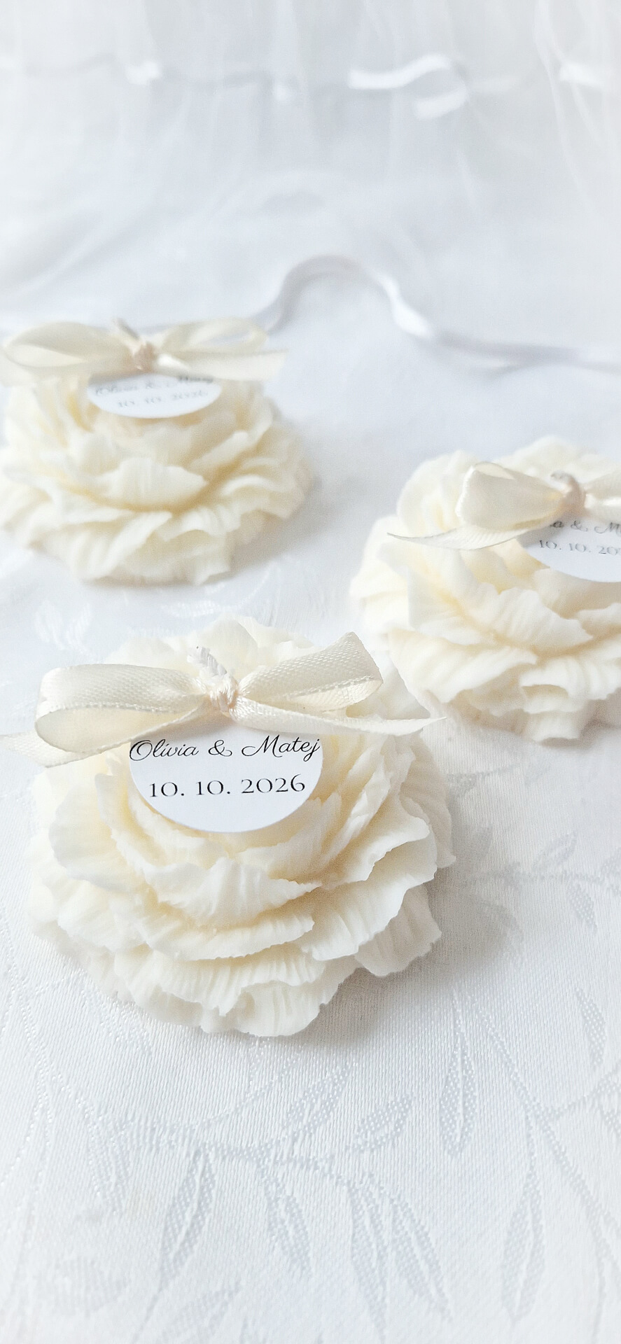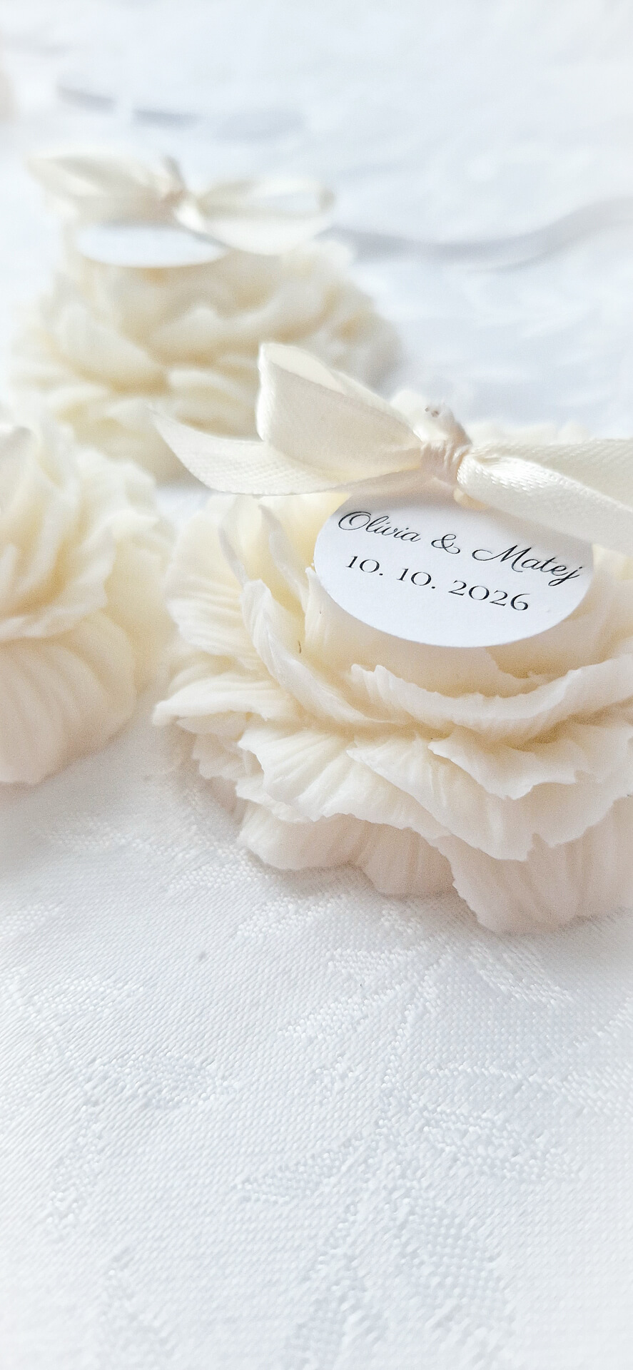 Obdarujete Vašich svadobných hostí jedinečným darčekom, ktorý im bude pripomínať Váš VEĽKÝ DEŇ. Táto prírodná sviečka je ozdobená saténovou mašličkou a medailónom s Vašimi iniciálmi. Stačí, ak nám Vaše mená a dátum svadby napíšete do polí nižšie a my pre Vás vyrobíme výnimočné a osobné darčeky na mieru. Každá sviečka z tejto kolekcie je ručne vyrobená zo 100-ného sójového vosku a v jej srdci sa nachádza bavlnený knôt, vďaka ktorému sviečka horí jemným plamienkom. Je jedinečná svojím tvarom a vyrábaná s láskou a trpezlivosťou. Vytvorenie takejto sviečky trvá niekoľko hodín. Môže mať malé nedokonalosti, ktoré však z každej sviečky robia unikátny kúsok. Sviečku je možné vložiť aj do papierového obalu alebo tylu, čo pôsobí veľmi elegantne. Na výber máte aj niekoľko vôní tej najvyššej kvality. Je to jednoducho dokonalý darček, ktorým potešíte tých, s ktorými ste sa rozhodli osláviť spečatenie Vašej lásky. Vďaka tejto sviečke si tak odnesú kúsok atmosféry z Vášho svadobného dňa so sebou... Prečo si vybrať práve naše sviečky? - sú ručne vyrobené na Slovensku v malej rodinnej dielni - vyrobené z čisto prírodných materiálov - sú vegánske a šetrné k nášmu životnému prostrediu - horia dlhšie ako bežné parafínové sviečky - sú netoxické, neobsahujú olovo ani iné škodlivé látky Sviečky sú vyrábané na objednávku, preto ich odoslanie môže trvať viac dní. Rozmery sviečky: - hmotnosť vosku - cca 50g - šírka - cca 5,5 cm - výška - cca 2,5 cm